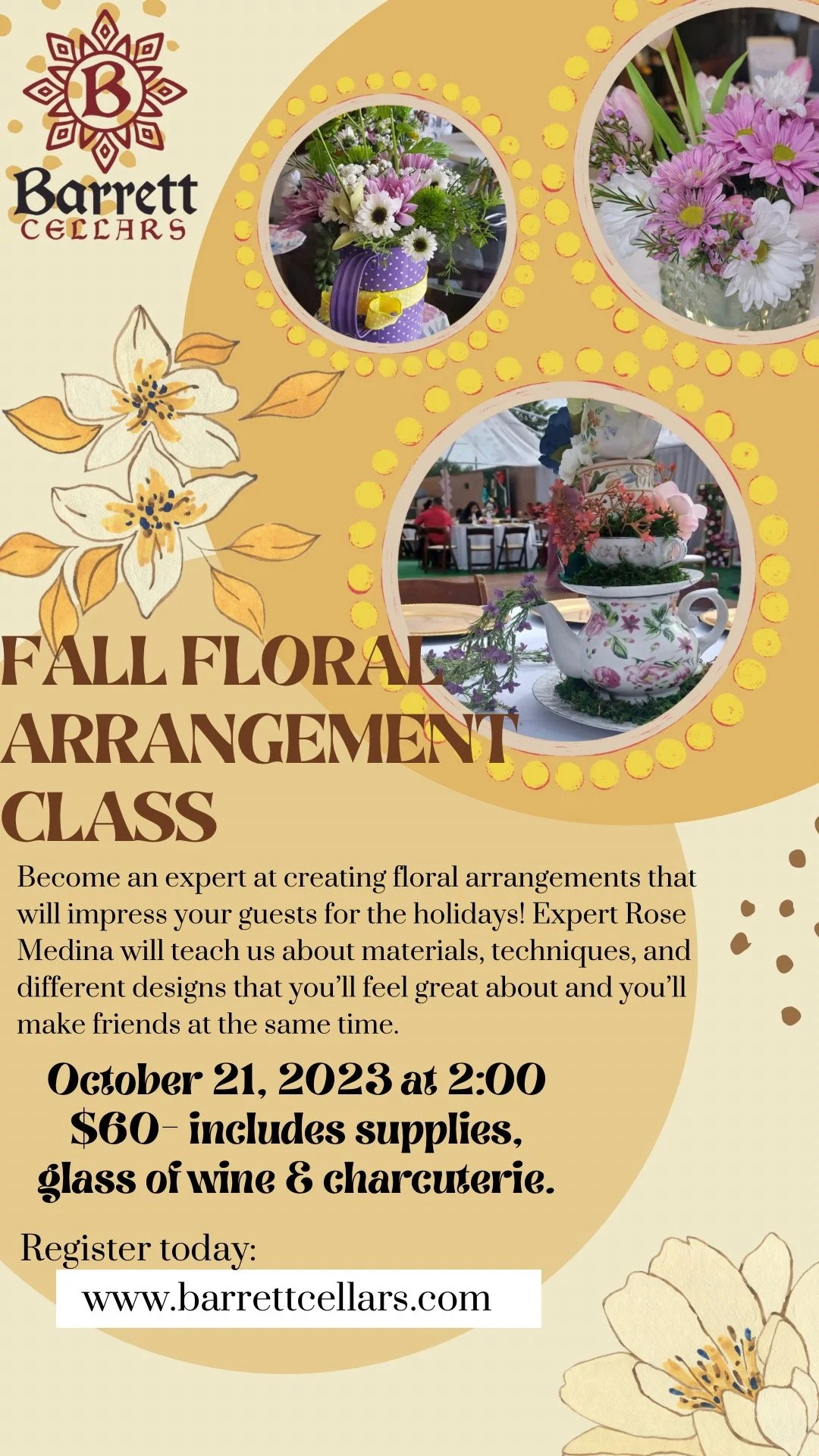 Join us at Barrett Cellars for a floral arrangement class for your fall table! Roses by Rose will teach us to put together a beautiful arrangement to take home. The class is $60 and includes all supplies, a glass of wine & a charcuterie spread.